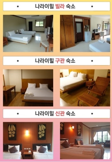 나라이힐 리조트는 클럽하우스와 이어진 본관/신관 /빌라동으로 되어 있습니다. 전 객실이 골프뷰로 되어 있으며 빌라동 앞에는 수영장이 있습니다. 전객실에는 에어컨, TV, 드라이기 와이파이, 커피포트등이 있습니다.