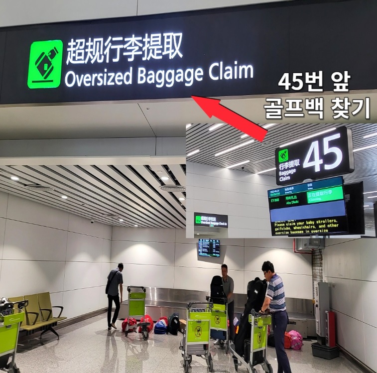 인천국제공항에서 광저우 공항까지 약 3시간 30분 소요되며 기내에서 내리신후 입국심사를 마치고 수화물을 찾으러 가신후 골프백은 아래 표지판에 표시되어 있는 게이트로 가셔서 골프백을 찾으시면 됩니다.